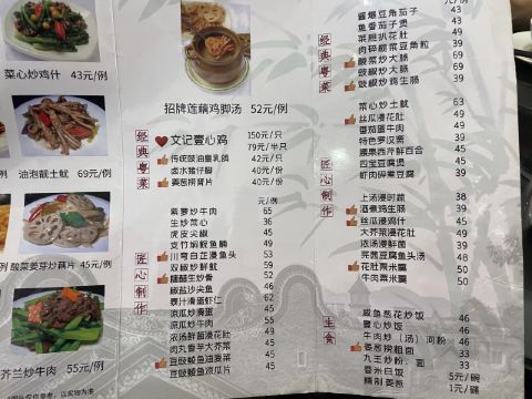 乳鸽,壹心鸡,鸡油炒菜心,秘制红枣骨,蜜汁大肠,菜心炒鸡杂,姜葱捞鸡肾,白切鸡,五柳鲈鱼,莲藕鸡脚汤