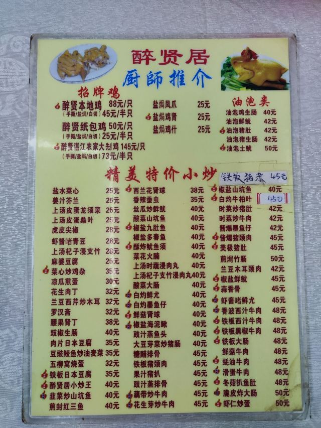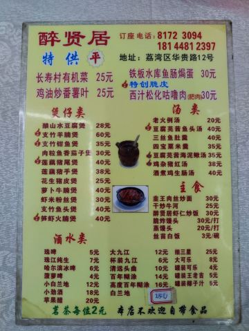 醉贤手撕鸡,盐焗鸡肾,椒盐九肚鱼,油泡鸡生肠,五柳炸蛋,鸡油番薯叶,白灼墨鱼仔,酱爆墨鱼仔,招牌手撕鸡,老火例汤,脆皮炸大肠,菜心炒鸡杂,本地爽皮鸡,莲藕焖猪尾