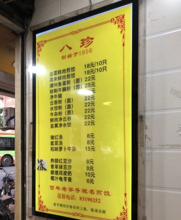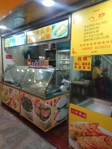 八珍饺子已经成为粤式煎饺的代名词了。这家老字号对自己的煎饺也十分有信心,在铺面招牌上就写了自己的标语:“百年老字号,驰名煎饺”,不过确实多年来都保持了同样的水准。韭菜煎饺和玉米煎饺是点的最频繁的两种,再点一碗猪红汤或者紫菜汤,一个人吃也特别满足。环境什么的就马马虎虎了。