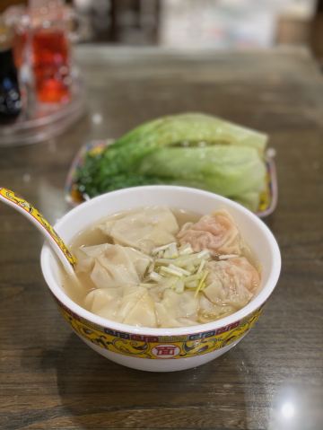 陌染MM之前抢到了一份橙V双人餐来到这里,这一家分店位于番禺区市桥的易发街,在光明北路这一头,平时经常去市桥觅食,很多时候都会路过这里。面店的装修有点老广的味道,传统的红木桌子、椅子,还有木柜子作装饰。这里的服务态度很好,每一位服务员都很热情,出品很快,一会儿就吃上了热乎乎的云吞面,刚好那天不太想吃饭,云吞面马上变成了美食。 {鲜虾蟹籽云吞面},云吞很大一粒,非常饱满,大概有六粒的样子吧,忘记数一下了,由于里面有蟹籽,所以吃起来有卜卜卜的口感,虾仁也很爽口,每一粒云吞里面都有一只大大的虾仁。面条也很爽口,比较喜欢这里的面条,因为不会很重碱水味,很怕那种味道,汤底味道很浓,如果稍微加一点大红浙醋味道会更加棒。 {五宝云吞},这一份云吞我是直接打包带走的,因为我只有一个人吃不完,五宝云吞也是忘记数多少粒了,五宝应该是有五种不同口味的云吞,以一种两粒的量,一碗下来应该是10粒吧。我吃了一种里面是有螺肉的,就是日料餐吃到的那种螺肉,蛮新颖的,有创意哈。 {蚝油生菜},生菜满满一大碟,很新鲜,但是就是碟子有点小,蚝油放得太少,吃过了上面几片青菜以后,就是淡淡的、没有酱料的生菜,建议碟子大一点,蚝油适当可以多放一点。 总体口味不错,不想吃饭的时候来一碗老广传统的云吞面也是不错的选择。