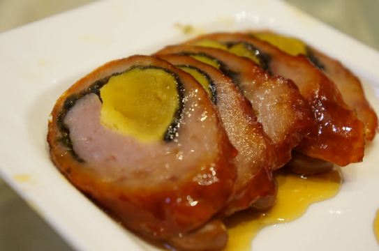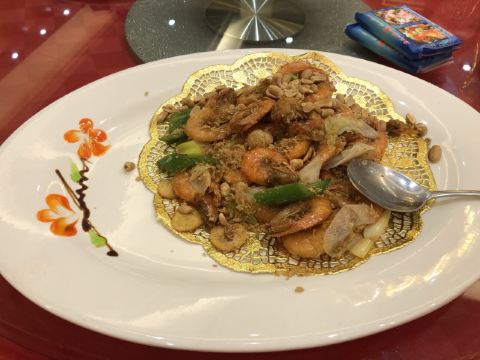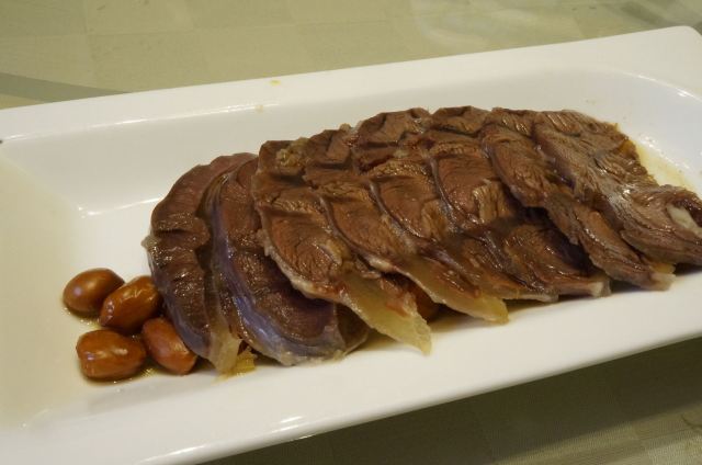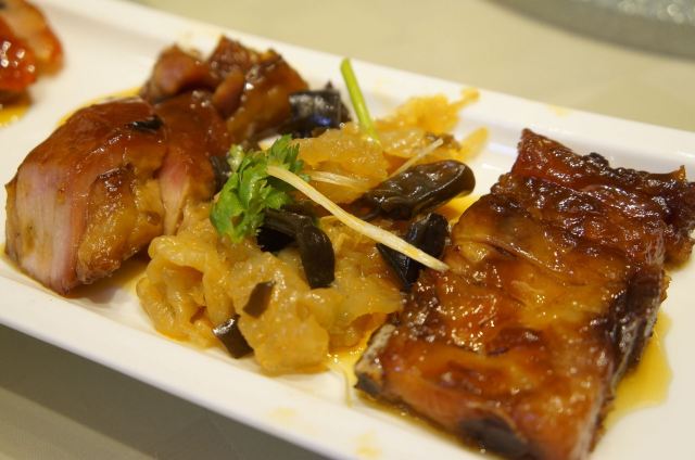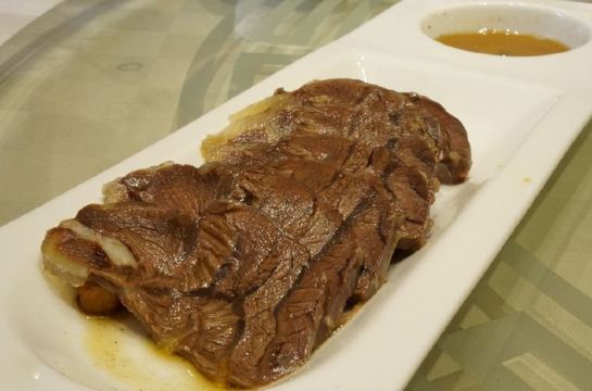 Tang Yuan Restaurant唐苑酒家是广州比较老字号的粤菜,以前比较出名的是在流花公园内的“白宫店”,可惜由于公园内不能开设酒家,现在已经关闭了,就只有这家分店了。点了几个菜,首先上菜的是明炉碳烧青鱼,这个份量比较少,只有5块,大家都不够分,吃了一小块,表面烧得有点香脆,没有鱼骨,全是鱼肉,肉质比较厚实,但味道偏咸了一点。        潮式汾酒牛展,同样也是精致的份量,牛展为牛腿部,带筋腱的肌肉,咬起来很有劲度,采用了潮式汾酒炮制,吃起来有一股独特的酒香,蘸上旁边搭配的酱料味道更为浓郁。          深井烧鹅,广东烧鹅最著名的是“深井烧鹅”,这盘烧鹅看上去比较多肥膏,吃起来较为油腻,而且皮不是脆的,肉质不够结实,口感不太新鲜,感觉是烧好了,摆放了很久然后再重新加热。        粤式烧味拼,这个拼盘有很多不同的烧腊,其中包括:烧肉、烧排骨、海蜇、蜜汁叉烧、桂花扎等组成。