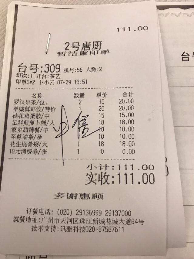 老实就奇中午和朋友来到2号唐厨(优托邦店)喝茶。 2号唐厨(优托邦店)位于珠江新城花城大道中84号优托邦1座6层,从地铁五号线猎德站A口出来,步行几分钟就到达,交通非常方便。 中午十二点钟,大厅还有一些空位,找了靠里面的地方坐下,后来才感到后悔,里面比外边吵很多。 环境富丽堂皇,不过服务跟不上。例如让服务员开普洱茶,她却上了罗汉茶,后来才知道后者贵一些。又如午市一桌可以点两个特价点心,询问服务员爱理不理的,最后才拿出特价菜牌。再有加水服务员也是千呼万唤不出来。 【桂花鸡蛋散】挺大份的,蛋散酥脆,沾着桂花蜜吃,蛋味和桂花的香味融为一体。 【家乡甜薄餐】一碟三口,很香脆,里面是花生、芝麻鲜。 【至尊油条】很大条,卖相一般,吃起来不脆,不过比较松软。 【羊城鲜虾饺】一笼四只,虾饺皮薄馅多,里面有好多只新鲜爽口的大虾。 【花生烧骨粥】量较多,粥底绵滑,鲜美可口。 【足料煎萝卜糕】较大的三块,煎得金黄,能吃到里面的萝卜丝和腊味粒。 埋单111元,人均消费56元。 总的来说2号唐厨(优托邦店)环境高大上,出品可口,服务有待提高。