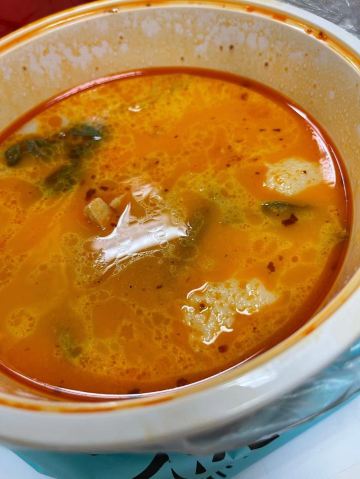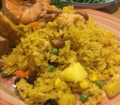 迪肯孔裴矩[菜式]去的比较晚,小伙伴没来的及慢慢一个看就点了个套餐,才发现原来那个4人套餐真是超值啊,吃都吃不完,具体菜单请看官自己去搜吧,就不一一罗列了,大概说一下印象比较深刻的菜吧。 [味道] 1. 先说下咖喱皇大虾吧,大虾也有起码七八只,个头还真的不小,咖喱味道不错的,不会很辣,椰奶味特别香,我们甚至还用剩下的汁来捞饭了[呲牙] 2. 相比大虾,烧鸡就没那么突出了,比较咸,味道也还可以,皮有点脆。 3. 猪颈肉一般般吧,也是有点咸。 4. 冬阴功味道不过不失吧,料还是比较足,除了有草菇还有虾也是挺大一只的,分量算OK。 5. 芒果汁感觉没有兑水,挺浓的,还是挺有芒果香,不会酸喔。 6. 沙拉和炒梛菜也是不过不失吧。