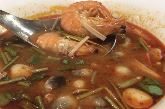 Thailand Restaurant[菜式]去的比较晚,小伙伴没来的及慢慢一个看就点了个套餐,才发现原来那个4人套餐真是超值啊,吃都吃不完,具体菜单请看官自己去搜吧,就不一一罗列了,大概说一下印象比较深刻的菜吧。 [味道] 1. 先说下咖喱皇大虾吧,大虾也有起码七八只,个头还真的不小,咖喱味道不错的,不会很辣,椰奶味特别香,我们甚至还用剩下的汁来捞饭了[呲牙] 2. 相比大虾,烧鸡就没那么突出了,比较咸,味道也还可以,皮有点脆。 3. 猪颈肉一般般吧,也是有点咸。 4. 冬阴功味道不过不失吧,料还是比较足,除了有草菇还有虾也是挺大一只的,分量算OK。 5. 芒果汁感觉没有兑水,挺浓的,还是挺有芒果香,不会酸喔。 6. 沙拉和炒梛菜也是不过不失吧。