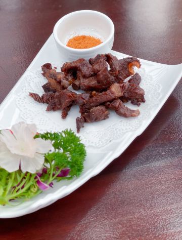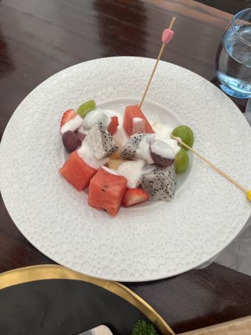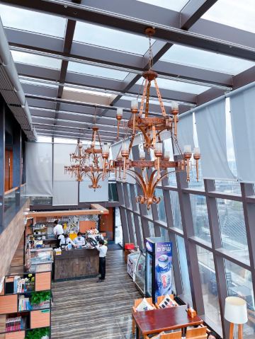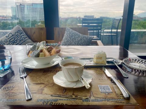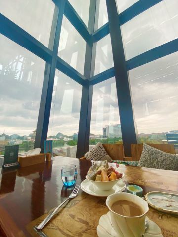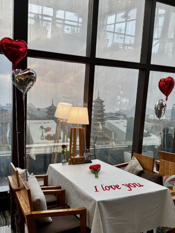 🌈这家餐厅景观超赞,是拍日月双塔的最佳位置之一,可惜我们赶飞机,没能赶上夜景。 🌿环境还可以,上下两层的玻璃房子,采光和视野都不错。关键是位置超棒,要是不下雨,可以坐在室外,点个三层的下午茶,可以让下午茶和双塔一起入境。下雨天么,只能在室内了,虽然室外部分位置也有遮挡,但是景观是偏的,如图1所示,也会有雨飘过来。 👩🍳服务还是可以的。点餐的小哥哥还是很nice的,推荐的套餐很靠谱。 🍽下午茶套餐有两种,一种是双层的,颜值比较高,一种就是我们点的,不怎么好看,但是很实惠,有牛肉干,有鸡翅,有水果,还有茶和蛋糕。 「黄金鸡翅」和必胜客的鸡翅味道差不多,挺好吃的。 「手撕牛肉」味道还行,就是咬起来费力。牛肉全欠在牙缝里,吃两块就吃不动了。 「红丝绒」甜度正好,带有淡淡的奶香,松软可口。 「水果沙拉」量很实在,水果也挺新鲜的。