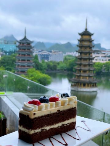 口味没什么特别映像,建议点些轻食就够了。服务挺到位的 每个服务员都挺细心。景观视觉角度非常好,店内二层平台看象鼻山,一层平台看日月双塔。树荫遮挡下屏蔽了地面人员吵杂,直到下楼才发现好多人。