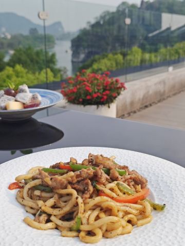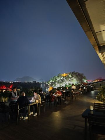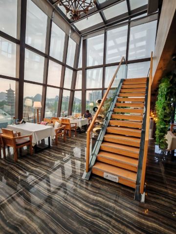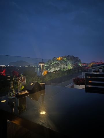餐厅的位置实在太好了。可以同时看到美丽的漓江,象鼻山以及日月双塔。不管是夜景还是白天都非常出片,晚上两灯光及象鼻山的灯光亮起来以后,夜景特别浪漫。