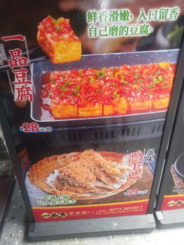一品豆腐,美味鸭下巴,脆皮白切鸡,酥衣蛋,卤新鲜猪脚,一品鱼,素炒丝瓜,白切漓江鹅,招牌沙拉卷,枸杞菜羊血汤,田螺,桂花糍粑,鸭下巴,干锅黄焖鸡,菠萝鱼骨,猪脚田螺,爆炒漓江虾,空心菜,龙胜井水鸡,凉拌鱼皮,铁板鱿鱼