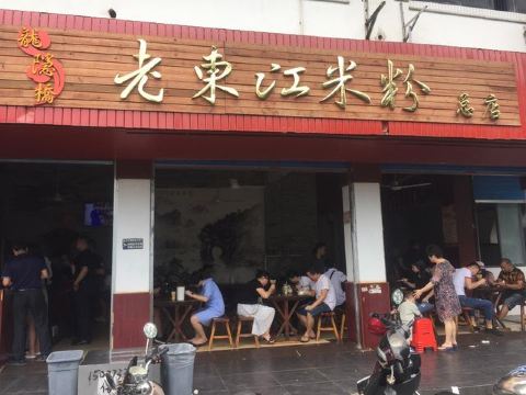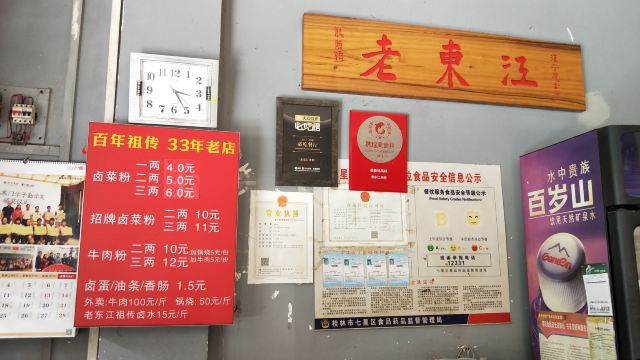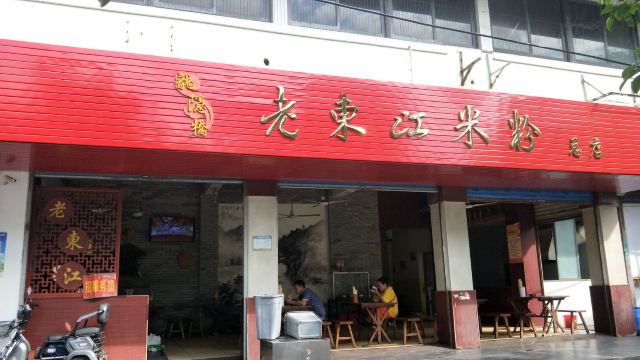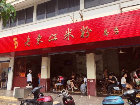 Lao DongJiang MiFen这是本人慕名来打卡的一家桂林米粉店 店面:老东江米粉(总店) 地址:龙隐路3号(靠近七星公园) 营业时间:早上6点至下午4点半,晚上不营业。 菜品: 本人点了一份三两的卤菜粉,价格6元(一两4元,二两5元,明码标价)。招牌卤菜粉要贵点(两两10元,三两11元)。三两卤菜粉分量够吃饱了。里面放有卤肉菜和花生,可自己添加小菜辣椒个(只有三样),还有筒骨汤(比较烫)。他们家的米粉比较劲道,桂林米粉用漓江水制作正宗。 体验过程: 这家老东江米粉总店需现金付款(不支持支付宝微信付款),到店现金买单(前台有个老大爷负责)给张票据,然后到前面做粉处出示等候(一个大妈负责)。 店里大概有九张桌子(有两张竹桌在里处),店里有机子售卖饮料和水,有风扇,装修环境比较简单。大概下午4店多就有阿姨开始收拾餐桌打扫卫生然后就要关门了。 这家盛在口味口碑不错,上了携程美食林榜单,值得一试。