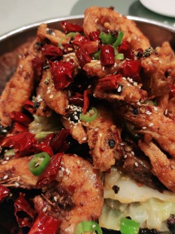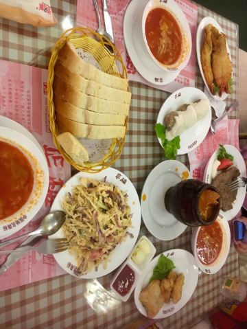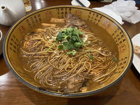 Zhiyin Jiulou目测是当地人来聚餐的酒楼,店内有不少包房或者圆桌,可供家庭聚餐~ 两个女生的话点两个菜绝对是足够了,就直接点了店内最推荐的锅包肉和得莫利炖鱼~ 用秋林格瓦斯做参照,这边的炖鱼真的是非常实在了,完完整整的一条鱼外,还有非常多的豆腐和粉丝,讲真两个人一锅都已经够了~ 炖鱼的口感整体是偏咸鲜的,所以一定要来上一碗米饭,非常下饭的一道菜了~ 锅包肉一定是要趁热吃的,凉了口感就会变了~ 整体炸的很酥脆,裹上甜口的酱汁,感觉可能是东北菜里最适合爱吃甜口人的一道菜了~ 真的量很足,所以如果旅游来的话一定要控制点菜量~