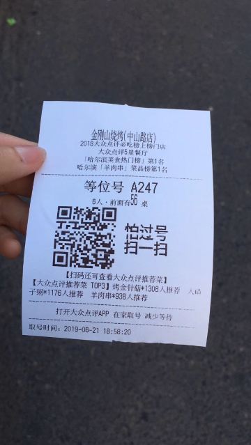 JIN GANG SHAN SHAO KAO金刚山烧烤是个不错的地方,太火爆了,排队的人非常恐怖,下午5点多就600多号人,太火了.... 免费的大碴粥,冻白菜蘸酱,韭菜和酸菜水饺,虾片,水煮花生谁便拿管够,但不要浪费,串随便点,都好吃,大串烤鳕鱼烤豆角和毛肚,好吃到回味无穷,加上哈尔滨啤酒绝配。