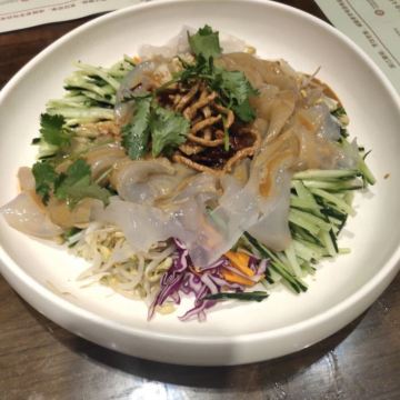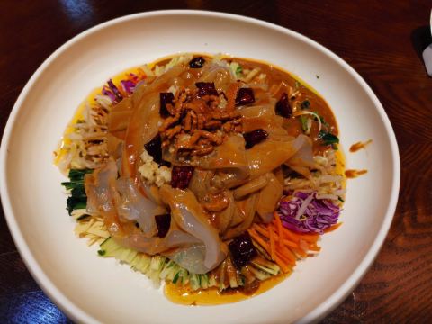 一点到店还是躲不过排队的命啊,好在只拍了20多分钟,点里有个介绍餐饮文化的区域,锅包肉的胸针很可爱。一个人点了锅包肉和拉皮,说这家店是锅包肉的创始者,说实话跟我在上海的东北才餐厅吃起来味道大差不差,麻酱拉皮倒是我最爱