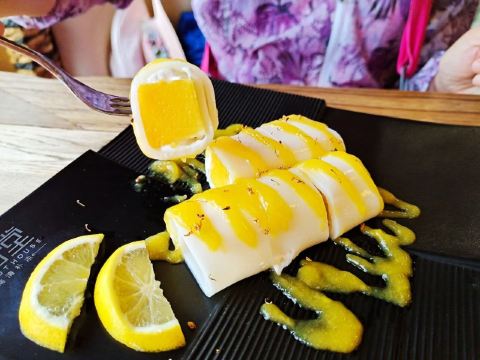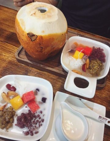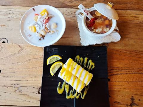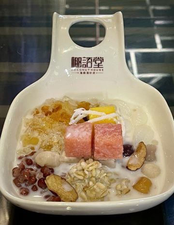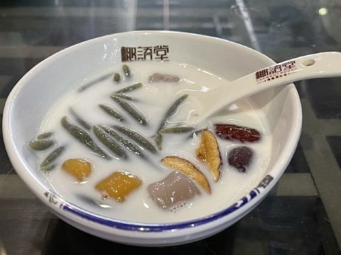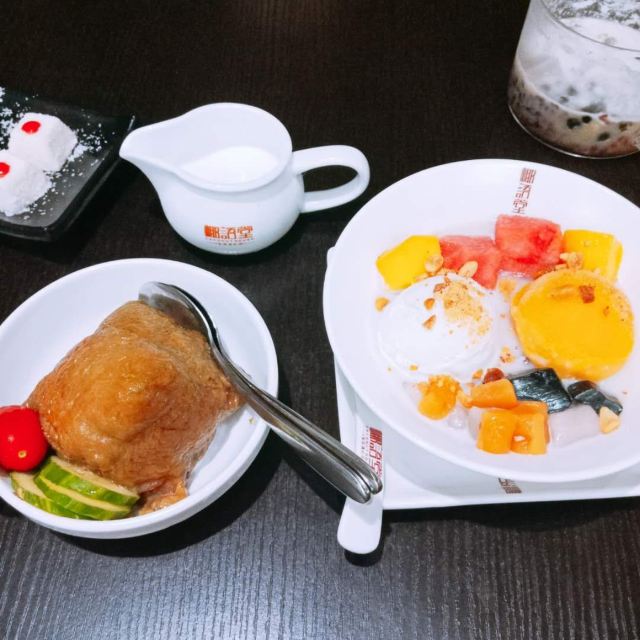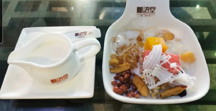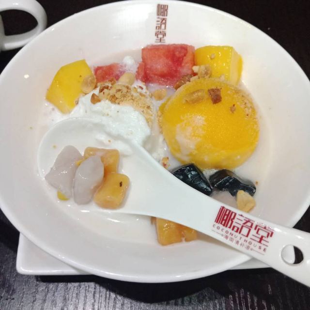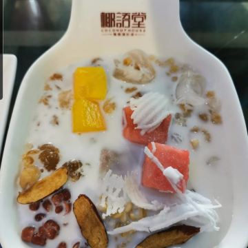 希措【椰语堂(中山骑楼店)】 1P&4P&8P.冰糖官燕桃胶清补凉 在传统清补凉的基础上,加入燕窝桃胶,桃胶的琥珀光泽,染入汁水纯白如玉的鲜榨椰奶中,搭配上燕窝,入口温润绵滑、清香甜美,鲜嫩滑爽,是一道美容养颜佳品~[机智] 3P&6P.椰奶桃胶清补凉(热) 鲜榨的椰奶,配上五谷杂粮,加入口感软弹的桃胶,甜而不腻,喝起来浓浓的奶香萦绕在唇舌中~[奸笑] 7P&9P.椰风芒果桂花卷 以芒果和奶油为馅,芒果卷皮以椰汁奶皮为面,用新鲜椰奶制作而成,皮薄且嫩,独特的海南热带水果兄弟搭配,滑嫩如丝,轻轻一切就能断开没有胶质的口感非常清爽![哇]