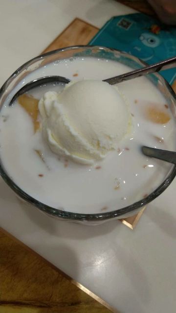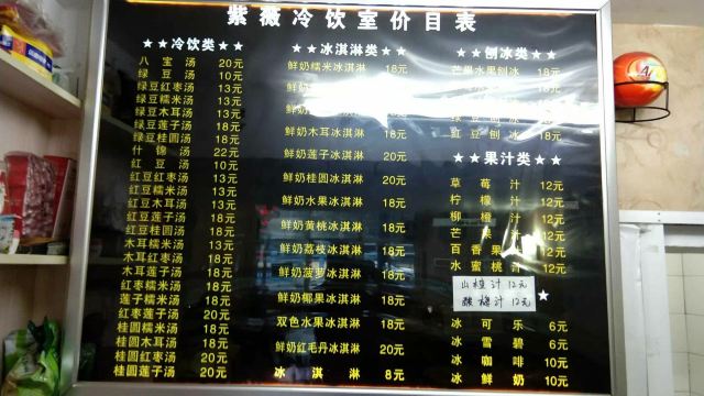 在盐官景区瞎逛的时候,有几个MM到处在找这家店,本着吃货的心也跟着去了这家冷饮店。 很复古的一家小店,因为刚刚饭点,店内人不多。选择了当家头牌八宝汤,里面货确实丰富:莲子、红枣、银耳、绿豆,还有糯米,估计是当地特色吧,以至于我以为是酒酿,第一次吃到这样的搭配。