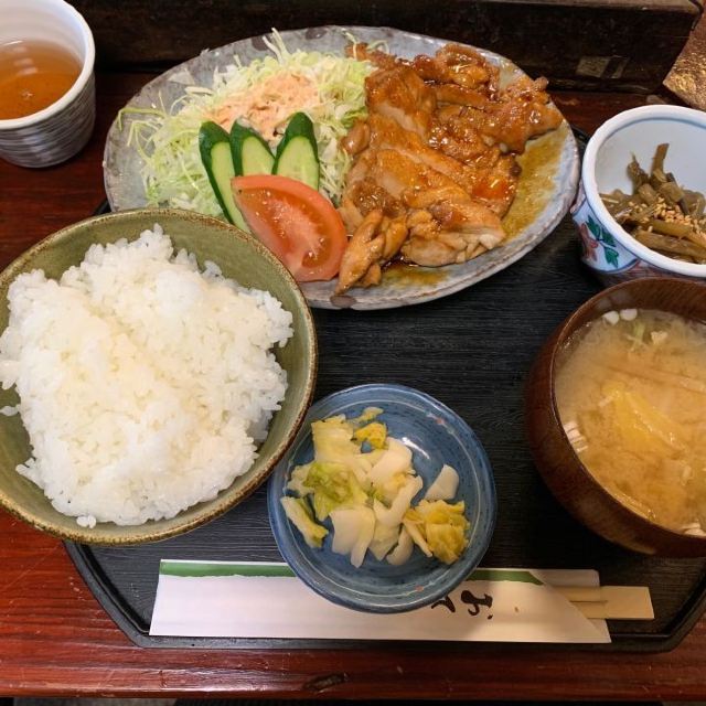 茄子の揚げ出し,鳥の唐揚げ,日式炸猪排,家常豆腐,もつ煮,味噌汁,炸猪排