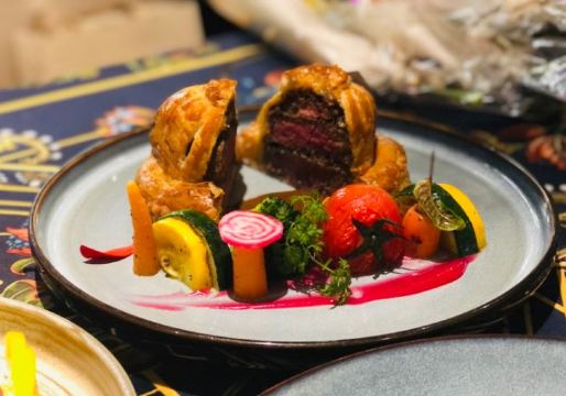 惠灵顿牛排,日式和风蒜香大虾意面,西班牙海鲜饭,澳洲雪花M7西冷牛排,芒果大虾沙拉,菌菇温泉蛋配土豆泥