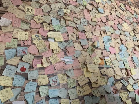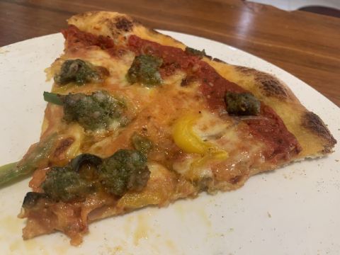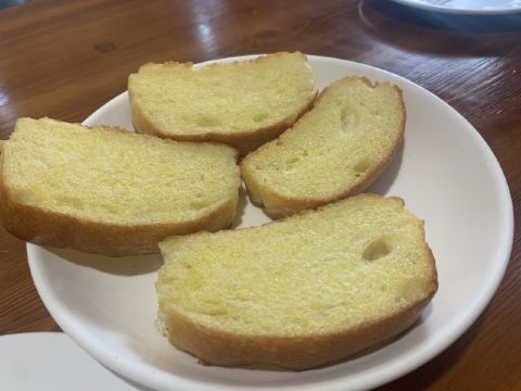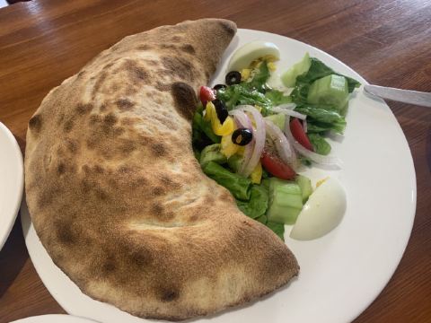 要不是因为来之前打了电话,都不相信这是正在营业的店……瞧这门脸,没有开灯的店面,隔壁桌小情侣帮忙叫了一下老板才有人出来。 再看墙上的留言,有内味儿了,是我们喜欢的小破店。 点了招牌的自制肉肠披萨,说肉丸还差不多,料非常足,芝士很多,薄饼底边是脆的,饼底是软的,浸了番茄酱,特别好吃。 巨盒披萨造型很特别,切开有很多汁,饼是软软的,馅儿的芝士非常多,还配了很新鲜蔬菜。 披萨是现烤的,要等,好在蒜香面包很快,脆脆的,有蒜香不过吃了不会满嘴蒜味,很棒。