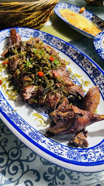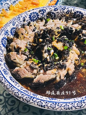 杭州吃货小e🌈小e美食探店‖🍵品龙井尝农家菜 樟乐茶庄·青瓷 📍地址:杭州市西湖区梅灵南路梅家坞91号(进停车场右边) ⏲️营业时间:09:00~21:00 🚏交通:公交103路,121路,324路,1314路梅家坞站 🏮 环境:这家店在梅家坞的停车场旁边,一栋三层农居房,院子里的地还弄成了🌈彩虹的颜色,让人眼前一亮,说明老板的心态还是挺年轻的,周边绿化空气都很不错,楼上有包厢可以供多人聚餐! 干菜蒸鳗鱼2⃣️3⃣️8⃣️RMB,用的是比较大条的江鳗,用梅干菜蒸是老杭帮的做法,梅干菜的香味可以有效的吸收了鳗鱼的油脂,让鳗鱼吃起来不会腻,肉质非常的细嫩而且没有腥味!值得推荐! 茶香虾9⃣️8⃣️RMB,用了自家种的龙井茶叶炸制后与二次复炸的河虾一起炒制撒上椒盐,酥香提味适合配点小酒🍶 🐔 鸡汤煲1⃣️2⃣️8⃣️RMB,这道菜基本是周边所有的饭店都必备的一道菜,本地鸡慢火炖煮,金黄的油脂会漂浮在汤上面,油很清喝起来鲜味十足不会油腻,鸡肉酥烂脱骨,适合聚餐大家一起分享! 🐂 荷花牛肉5⃣️8⃣️RMB,这种做法类似于金丽衢一带的名小吃“葱花肉”的做法,外皮炸的很酥脆,里面猪肉葱花改成了牛肉,味道还不错,如果加一个可以蘸的酱汁口感会更丰富! 🔈 服务:他家不管老板还是店员态度都很不错,刚到门口就非常热情的招呼,还会耐心介绍他家的菜品仔细询问有无忌口的东西! 💰人均:1⃣️2⃣️0⃣️RMB 👉🏻推荐指数:🌟🌟🌟🌟🌟