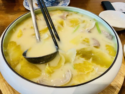 Madam Zhu's Kitchen运河边的一家餐馆,很赞!服务周到,菜品的味道也很不错的。有免费的水果和玉米地瓜可以先吃点。可以订位,很不错的。 「果木烤鸭半只」味道很不错,鸭皮蘸白糖格外好吃,还不腻 「酸菜炖猪肚」味道足,猪肚切得有点太大了 「XO酱粉丝大虾」不错的 「鲜菌时蔬自制豆腐」位都很好,豆腐很嫩