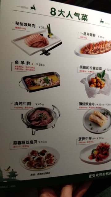 东坡肉,蛋黄鸡翅,冰淇淋烤布雷,酱烤活鲈鱼,糖醋排骨,糖醋里脊,蛋黄南瓜,话梅花生,一品开背虾,上汤菠菜,香烤鲈鱼,很脆的松露豆腐,鱼羊鲜,铁板鲈鱼,菠萝牛柳
