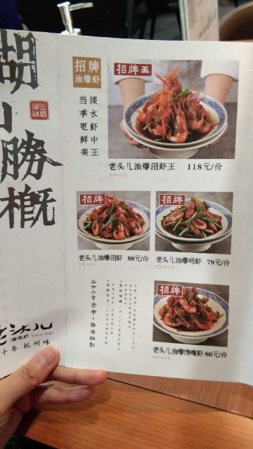 老头儿油爆沼虾,老头儿卤鸭,特色臭豆腐虾皮,老头儿白切鸡,桂花糖年糕,笼仔糯米酱排骨,宋嫂鱼羹,糖醋里脊,葱包桧,杭州老头儿油爆虾河虾,老头儿油爆明虾,干炸带鱼老头儿真传(小份),邬山腐皮杭白菜,酒酿圆子羹,干锅有机花菜,青椒钱塘翘嘴鱼,东坡肉,糖醋排骨,干炸带鱼,招牌油爆虾