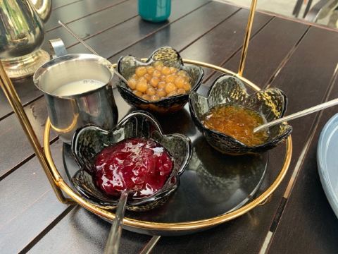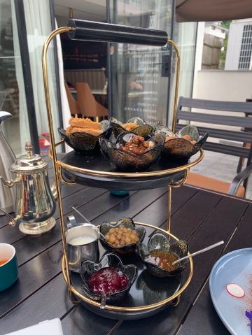 独孤雅剑之前喝下午茶去过还有一家店,两家店相比之下这家的环境更胜一筹,这家店是在四眼井的离动物园非常近,步行就能抵达,店里的环境非常好,有露天的户外座位也有室内的位置,这里停车比较方便,而且有停车券提供的,服务员的态度热情,喝下午茶的时候经常会过来帮忙加水的,樱桃鹅肝,樱桃的造型,食材用的是鹅肝,不过味道一般,有一股腥味,排骨会铁观音淡淡的茶香味包裹着排骨,吃起来的口感更清新,金汤藜麦鱼尾翅捞饭汤味道比较鲜美,里面都是很棒的食材,芥味鲍螺片淡淡的芥末味道,螺片有一点脆脆的口感不错,下午茶系列,提拉米苏可可味道挺浓的,甜甜的但是不怎么腻,配上红茶口感更赞,海盐太妃芝士,芝士的味道非常浓郁,是我比较喜欢的一款甜品,双层混搭甜品,各种各样的甜品,还有坚果等等,非常适合下午茶的时候坐坐吃吃聊聊天,斯里兰卡红茶这是我比较喜欢的一款茶,口感比较醇正,活动的时候价格还是比较实惠的