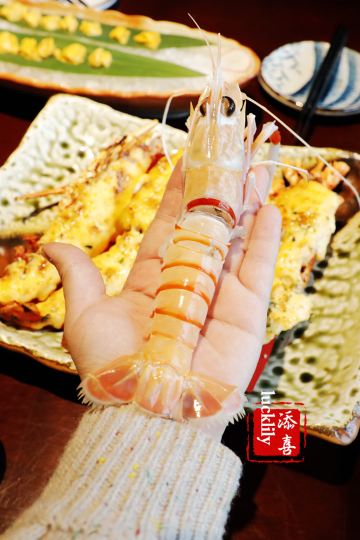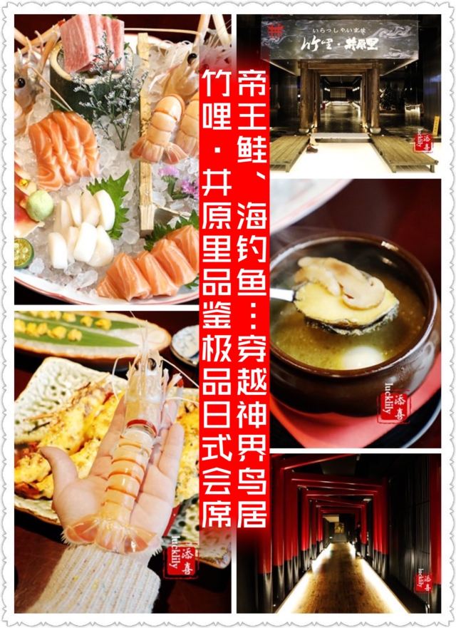 添喜lucklily⛩[环境]这一次听说竹哩新店开在了杭州大厦501,甚是欢喜!欣然而往,果然不负期望,3000平方米餐厅约对是杭州日料界的空间旗舰,30人的板前,60个大小不一的包厢,可容纳百人欣赏表演的日式演艺大厅,全店地暖让脚板快乐得想飞,踱步走过一排排矗立着的鸟居,相传鸟居是人间与神明相连的结界,步入的感觉宛若穿越, 井原里采用的会席+自助的形式,先上的是会席套餐7道菜品。 先付 「自制果脯」、新鲜的龙眼、去了皮的圣女果, 八寸 日式煎腐、拌海哲丝等等,集合了甜、酸、咸等多种口味,起到开胃的作用; 吸物 「海参鲍鱼汤」这道奢华的滋补汤实在是很厚道!用到大的鲜鲍鱼、海参、松茸,汤色浓醇,喝下去整个人都暖了,深度的鲜美! 造里 「刺身拼盘」想说会席中刺身拼盘用到的食材在杭州的日料界基本上都算是顶级的品质了,生长在800米下无污染深海的新西兰特级鳌虾,比我的手掌还要长,据介绍说要30年才能长到那么大一只,虾肉晶莹剔滑,清鲜可口;刺身拼盘中还有蓝鳍金枪鱼大脂(或许是中脂吧,但我却感觉是我最喜欢的大脂,因为中脂的口感觉还没有这么丰腴脂润);经常自购,早就发现三文鱼其实是有大的差异的,比如产地挪威的、爱尔兰的和智利的就有着截然不同的差异,智利的三文鱼真的比较差了,而此刺身拼盘中的三文鱼是真正的帝王鲑级的,主要还是口感,入口脂溢的舒坦与满足感;服务生有介绍还有的生鱼片是日本寒鰤鱼,寓意着加官进爵,也代表井原里祝食客好运连连,就冲这样的祝憬也要赞一个! 名物 「炭烤海钓鱼」烤制的火侯控得极好,鱼皮微微泛焦,而鱼肉保持着紧实的质地,筷子夹去,鱼肉顺着纹理散开来,非常的新鲜的品质,鱼肉很香,海钓鱼对于杭州的食客来讲,亦是稀见的美味了。 进肴 「芝士焗小青龙」澳洲小青龙半剖开,每半上覆盖了厚实的芝士,都可以拉出丝来,厚重的芝士裹着紧实的虾肉,岂止“好吃”二字可以形容? 强肴 「火炙澳洲和牛」 这个就比较厉害了,服务生会端着纹理清晰的澳洲和牛来到包厢,用喷枪现场将牛肉炙熟,竹哩选用的是天然牧场放养的草饲和牛,话说草鉰或是谷饲我都一样的喜欢,草鉰的精良一些吧,烤完一面之后,裹上特制的日式醋和萝卜泥之后再烤,熟度可以自己选择,我们选了五分,入口脂化,溢齿留香。 七道会席之后就是放题啦!