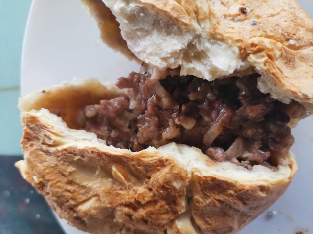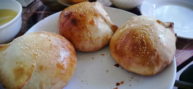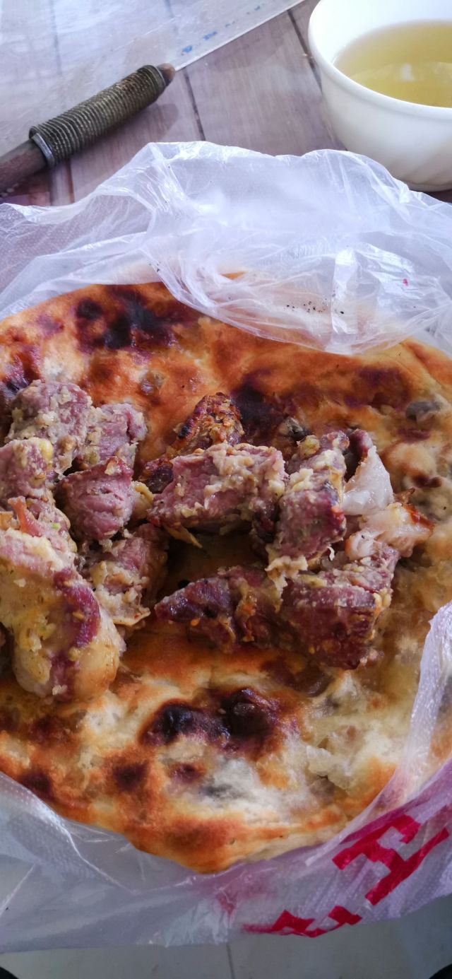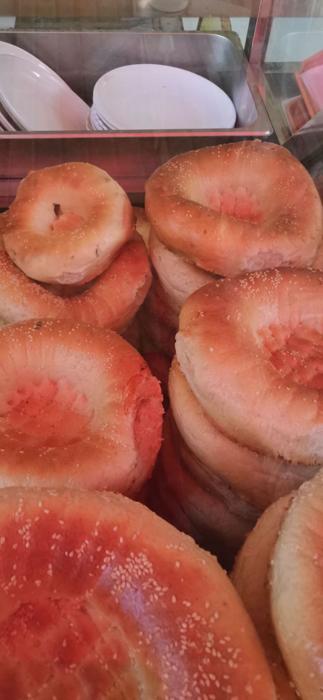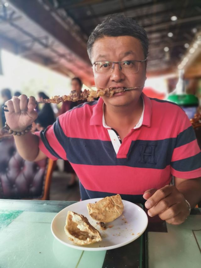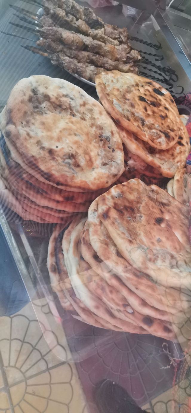 烤包子五元,大烤包子十元,大包子吃一个就饱。我的手只能抓住一个大包子。大包子里面填满了羊肉,肥瘦搭配刚刚好,一点不会腻,就是香。包子是在馕坑里面烤的,面皮烤得非常硬,吃之前要把表面的灰擦掉,坚硬的盐巴结晶要用专门的矬子清理,当地人会用茶水把包子泡软了再吃,我觉得硬着吃也很香。这个店还有烤肉和馕,烤肉十元一串份量特别足,我自己吃一串就感觉过瘾了。很多当地人来吃,店里的伙计运送包子时大声吆喝特别好玩。来到和田一定要来这里体验。