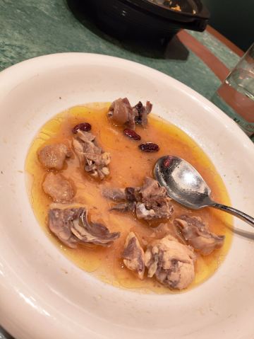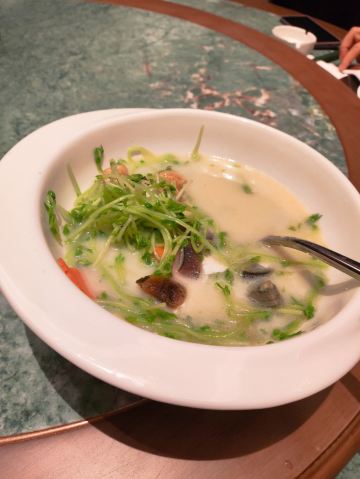 走进店里,装修看上去比较高档。一看菜牌,也是高档水准,只能随便点几个普通菜。隔水蒸鸡:听本地人介绍水蒸鸡,可喝汤吃肉,就点了,结果上来,汤汁真是咸,根本不能喝,纯粹吃点鸡,肉质还好;上汤豆苗:一般般吧,到处味道都差不多;牛肉炒饭:份量还可以,味道也还好,个人觉得还不错。