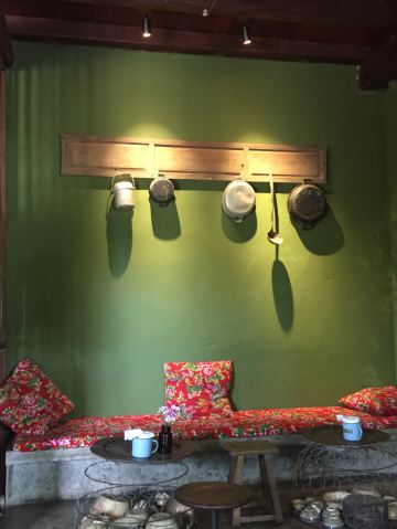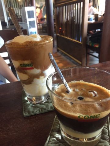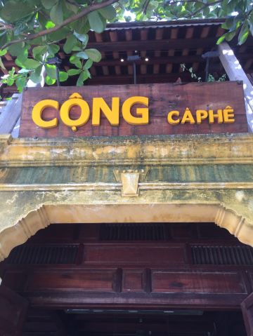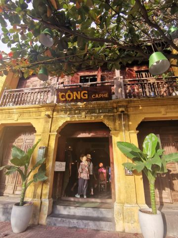 Cong Ca phe 《越共咖啡》的裝潢 散发懷舊风 利用大花布做成抱枕 椅墊 老舊的鍋碗瓢盆做成牆面裝飾 深咖啡及墨綠的色彩 營造出復古文青気息 是热门打卡点 在胡志明市一位难求 印象深刻 走访会安 自然不能錯过 坐落在会安古城秋盆河旁 㺽境大好 從二樓的靠窗位子 可以欣賞街道景色 以及河道風光 越南咖啡 十分濃烈 加了煉乳 還是可以感觉咖啡的苦味 只有当冰塊溶化时 甜度才是稍微好一点 椰子冰沙 真是創意極品 是一年四季 都推荐的饮品 除了便宜又好喝的咖啡 店裏也販售小食 是一个人逛会安古城时 充电歇腳的好地方~