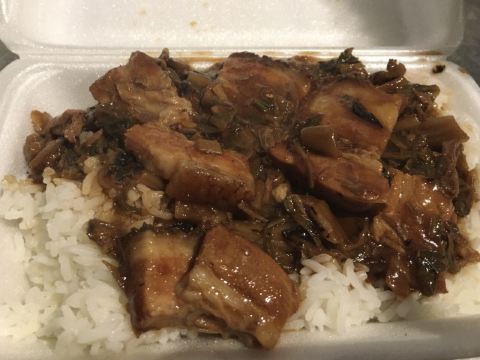 黄竹坑道周围都是工业大厦,饭馆很少,吃饭的地方多叫作“食堂”,确实有着食堂风范:装修简单、座位挤。在新坤盛食堂买了扬州炒饭、梅菜扣肉饭,外卖,共80元,可微信付款。份量大、味道好。疫情期间,每周日不营业。