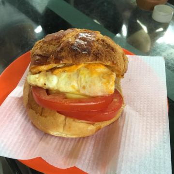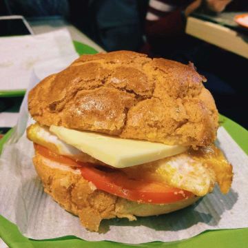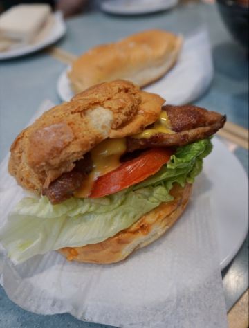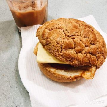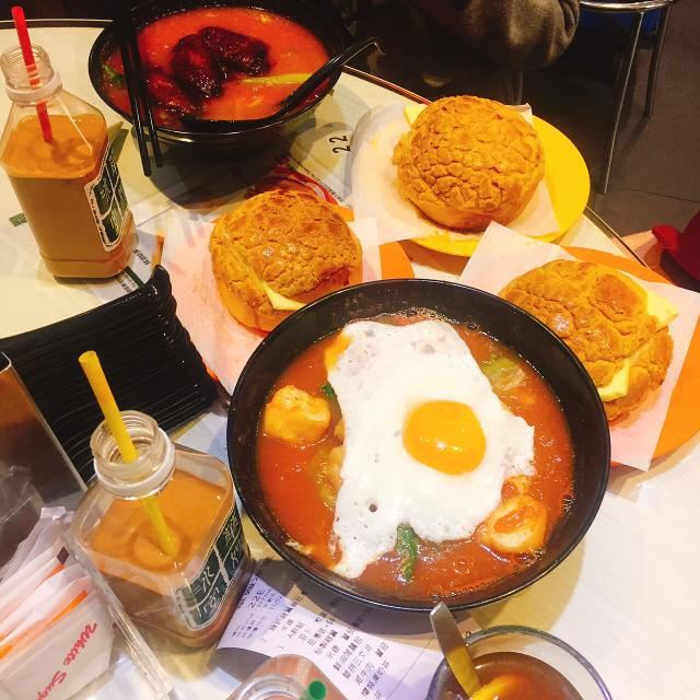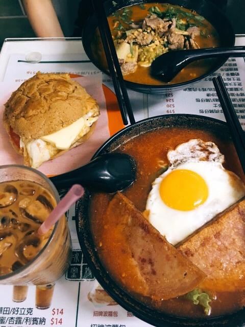 这家店比起那些店宽敞整洁不少,最重要的是可以刷支付宝!点了个招牌的番茄鸡翅猪扒面(把通粉换成方便面竟然还要加钱。。。)方便面在香港这么值钱??倒是挺好吃的(真香。。。)这家菠萝油里还夹鸡蛋和番茄。。