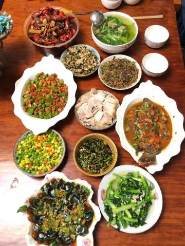 干锅有机菜花,扣碗大酥肉,霸王菜拌鸡丝,湘北小炒肉,自制皮冻,山西过油肉,蒜蓉时蔬,招牌烤鱼,糖醋茄子,干锅百叶豆腐,家乡大拌菜,葱拌鸡丝