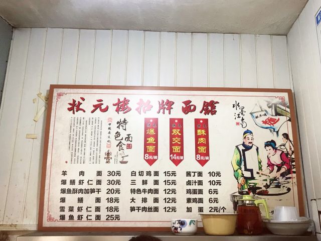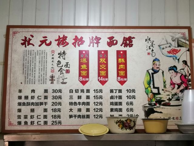 双交面,爆鱼面,酥肉面,鳝丝面,笋干肉丝面,爆鳝虾仁面,双交面加笋干,大排面,焖肉,状元面,雪菜虾仁面,五花肉,素鸡,酱丁面