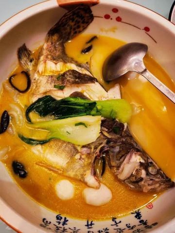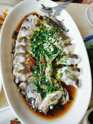渔人码头这里的餐馆多到爆 选择这家 一是好友评价不错 二来小伙伴投票决定 凭消费单可以免费停车吃饭 五点不到 入座率已经很可观 多为大圆桌 一侧靠窗景观位都被预订了 点菜到前台 有各种新鲜时蔬、半成品展示 喜欢哪里点哪里 「秘卤凤爪」¥4/根 凤爪饱满 卤味的很好 「太湖白鱼」¥58/斤 整鱼划刀 一块块肥厚的肉质鲜嫩不已 得时刻注意小骨刺 「白虾」¥48/斤 葱油酱底 很鲜很香 停不下口 「老鲜肉饼」¥4/块 炸制金黄 一块块很实沉~被香气迷倒 又被油肉腻到 很复杂 既喜欢它的香 又害怕它的油 「柴火湖羊肉」¥118 红烧入煲 羊肉不膻 吃口黏嘴巴 感觉胶质很足 「手工鱼圆」¥30 模样有趣极了 扁平的椭圆 纯手工打制的鱼圆 洁白透亮 弹性十足 「秘制老鲜鸭」¥98 油光蹭亮的整鸭 酱汁裹满全身 浓郁入味 有一丢丢鸭毛没剃干净 味道不差 个别湖鲜挺喜欢 吃完出发月亮广场咯