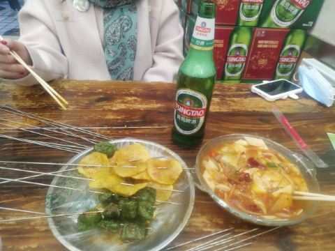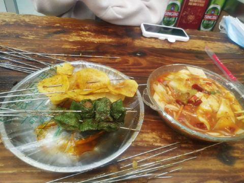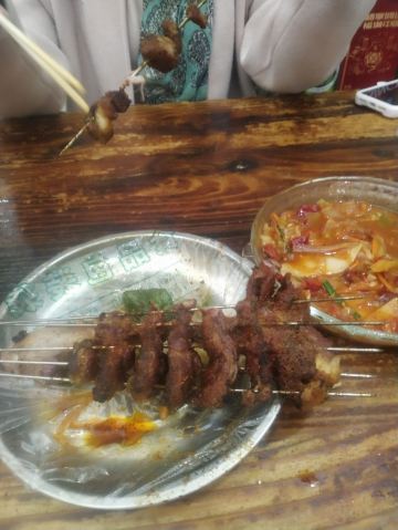 去嘉峪关怎么能不吃一次烤肉呢?是的我来了,眼镜烤肉,人超级多,桌子摆在了马路上,点了招牌烤肉,烤羊排,烤羊肚,还有土豆,鱼豆腐,茄子,金针菇,蘑菇。推荐炒的馒头,馒头丁配着洋葱辣椒和孜然炒的很好吃。
