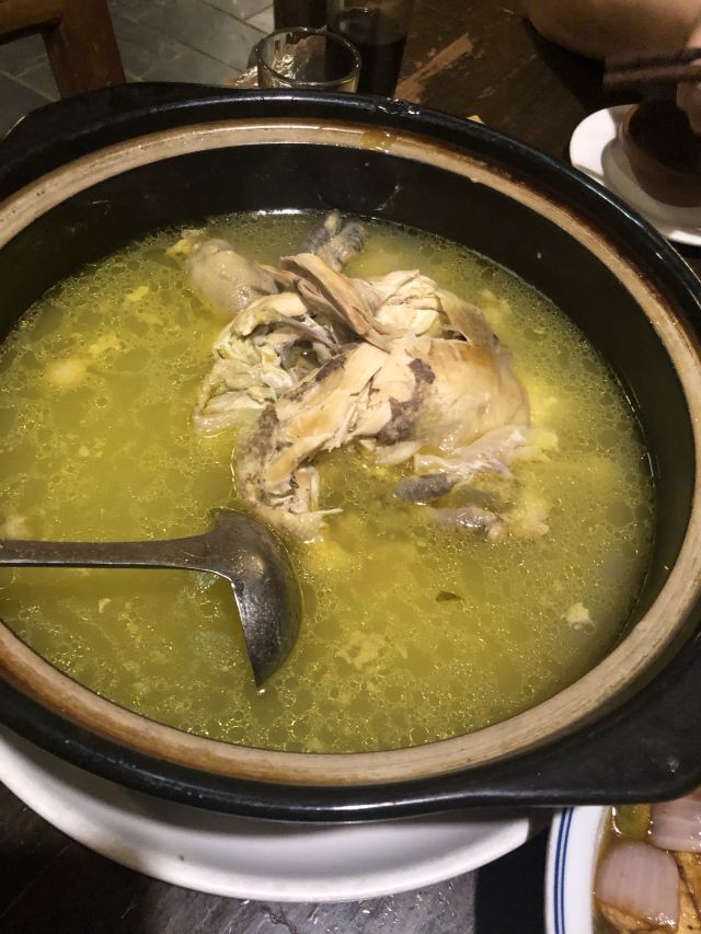 野菜饼由野菜混合猪肉裹粉炸制,外酥内软,非常香。土鸡汤又香又鲜,喝了好几碗。环境很好,依着青山,傍着泉水,小院古朴雅致,主人也很热情。