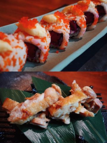 静雯爱吃又怕胖店铺地址位于晋江五店市 闽南古厝内 内饰以日式风格为主 雅致又古朴 每张桌子都是榻榻米的小包间 环境一百分!!进门就会有穿着浴衣的小姐姐很热情的安排位置 入座后便端来茶水和餐前点:芥末章鱼、泡菜、红豆 【柚香和牛牛舌】牛舌炖煮得软嫩弹牙 搭配上炸制过的山药条 口感层次丰富 【煎烤青花鱼】外皮是烤制过后的焦脆感 挤上柠檬汁更能激发鱼肉的鲜香 【海螺】肉质紧实Q弹 蘸上wasabi和日式酱油 略呛的wasabi味直冲天灵盖 整个人神清气爽 【刺身三品】三款刺身都是厚切 鱼肉新鲜 油脂丰富 【柚香鸡腿肉】柚子的清香和鸡肉融合得恰到好处 鸡皮煎得焦脆 鸡肉软嫩入味 【海鲜炒饭】米饭、洋葱、鸡蛋、三文鱼鱼肉等 炒制金黄 顶端还撒了鱼籽增加口感 米饭粒粒分明 一点都不会有油腻感 搭配三片腌制过的酱瓜可供吃完后清口 吃饱喝足后 店内还提供了浴衣可供客人换装拍照 无论是环境还是服务在大泉州日料届都是数一数二的