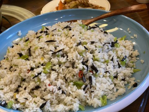 一整锅的菌子,眼睁睁得看着他煮了半个多小时。据说不煮熟的菌子有毒,吃了能看到小人跳舞。味道鲜的不得了,眉毛掉下来。炒饭也很赞,感觉吃出了松露的味道。