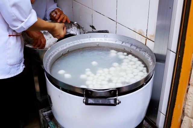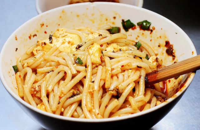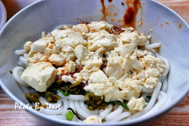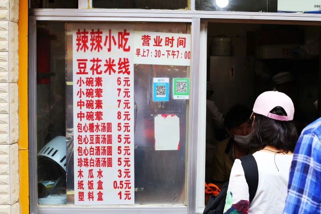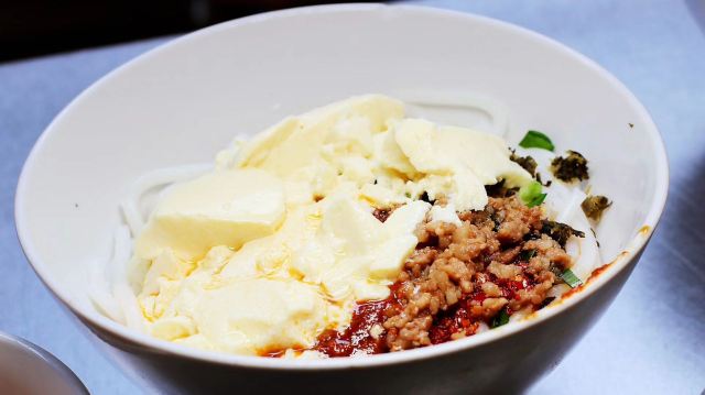 辣辣小吃豆花米线,没有招牌,门面就早篆新菜市场里面,昆明人自己的早餐铺子,很多本地人走累了就在这里歇脚吃一碗汤圆或者米线补充能量。 我们要了个中碗荤8元的米线,里面一勺子细嫩的豆花以及肉臊子,混合调制的辣子油和酸菜颗粒,最主要的还有小米辣,吃起来酸辣辣的口味,米线较粗,烫得比较软,毕竟这里很多老爷爷老奶奶,不能像我们年轻人一样还要吃个Q弹和韧劲。 再来一碗包心豆沙汤圆,就是煮好的汤圆撒上豆沙和红糖水,我吃米线,颜泽不吃辣就吃汤圆,正好。 小店生意好,就是最民间的味道,能得到普通老百姓的认可。