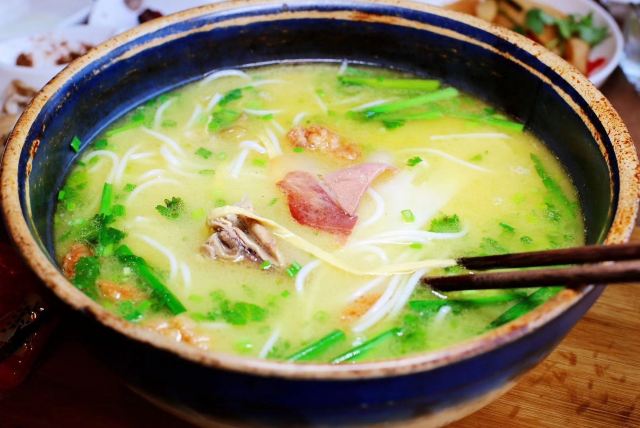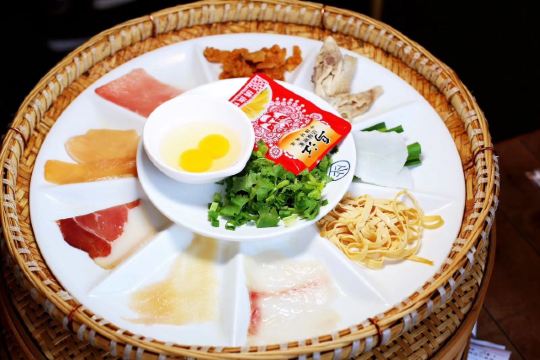 云南很多过桥米线,这一家就是环境打造很舒适,雅致且形式感很强,上桌子把火腿、蛋、鱼片、肉片、酥肉、豆皮丝等等辅料装在簸箕里,再上一口热气滚烫的砂锅,自己动手,先下生肉后下熟肉,最后下素菜以及那一大碗米线。 味道我感觉不出来有多好,但是在我增加了很多盐和辣子油后立马变得好吃了。 其他的烤鸭等配菜还不错,对火腿爱好不明显。糖腿破酥包很不错,甜甜的味道加了火腿口感很不错的。