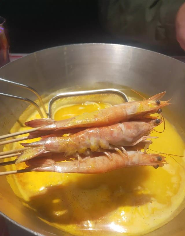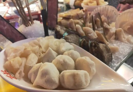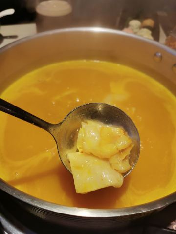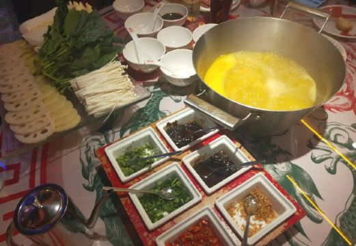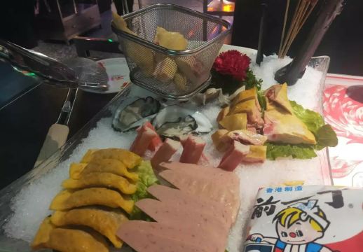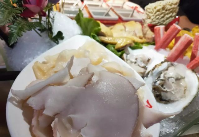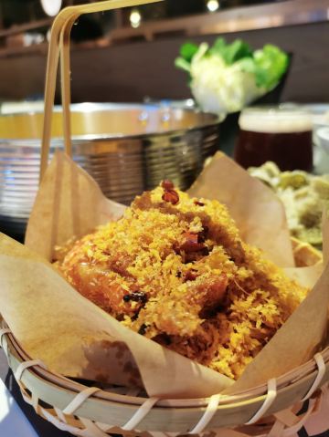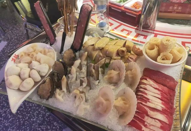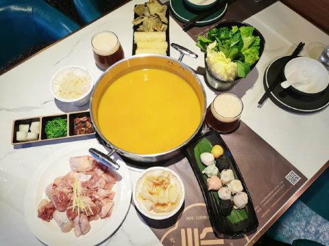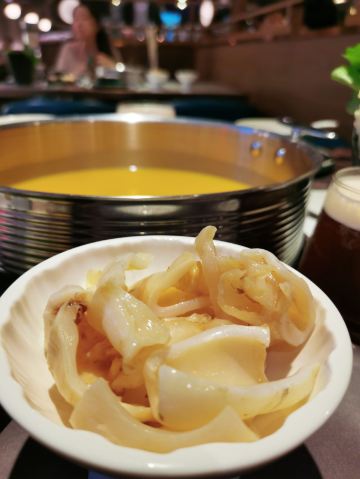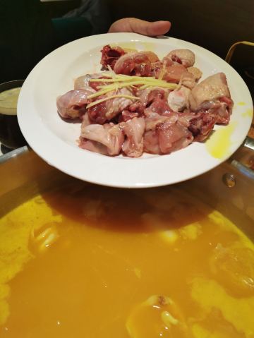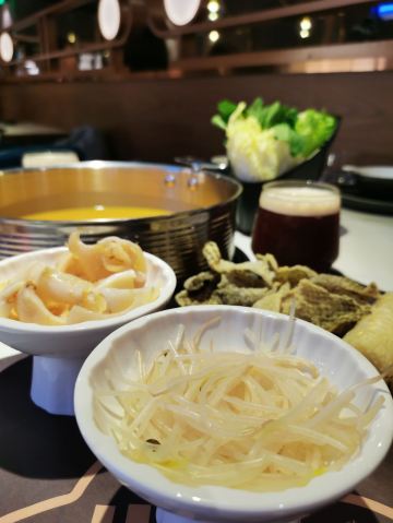 Buzhanhuajiao Chicken•dabianlu (nanyaqijian)花胶原来是深海鱼的鱼漂,配上精选自广东清远的散养走地鸡,肉质鲜嫩紧实,皮薄肉香,下锅后就着高汤,鸡肉无比的鲜美,入口带有丝丝清香。如果觉得吃肉太清淡,旁边还有精致的六宫格蘸料,完全可以根据自己的喜好来配。花胶吃入口中,q弹软糯,鲜美无比,在涮东西的之前先打一碗金汤,金色的汤底中融入了南瓜的鲜甜和金灿灿的颜色,简直先到了极致,唯一的缺点是微咸。旁边的金牌CP是满满一大盘的海鲜拼盘,有生蚝,鲜活的大虾,蟹肉棒,丸子等等,每一项都散发着天然的鲜香,一只只饱满的生蚝,鲜气十足,一口咬下去,汁水在口中迸发。