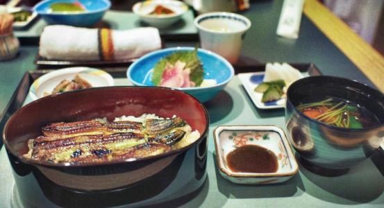 刺身,鳗鱼饭,烤鸡肉串,鳗鱼肝汤,蒲烧鳗鱼配饭,鳗重,鲤鱼刺身,白烧鳗鱼,烤鳗鱼肝,柳川锅,甜点 (老松的柚子),蒲烧鳗鱼,寿司,鱼料理