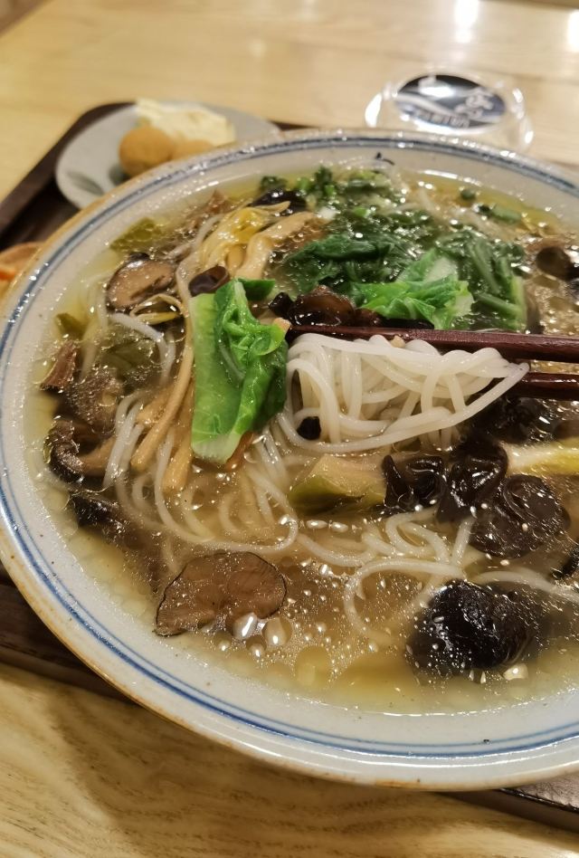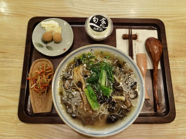魔女锦鲤旬食藏地时令定食(八廓街):西藏行程的最后一天,下午的飞机,打算早上再到八廓街逛逛,搜索了一下附近的美食,看到推荐的这家餐厅,妻子的浪漫旅行5,刘涛她们也来品尝过,离开拉萨前也来品尝一下吧。早上10点半才开始营业,在附近溜达到营业时间就过来,简约偏日式的装修风格,食品主打是首家藏地有机定食。点了一份藏地野菌鸡汤粉定食,另外赠送时令野菜+水果+有机牦牛酸奶,价格比普通的米线贵一些。米线的汤底很浓郁清甜,餐单介绍汤底是现熬了6小时,采用精选的野生菌,药材,土母鸡,豚骨等等熬制。米线可以免费添加一次。搭配的凉菜小吃味道也是不错的。因为没吃早餐,一个人居然吃了一碗半米线,也是够撑了。
