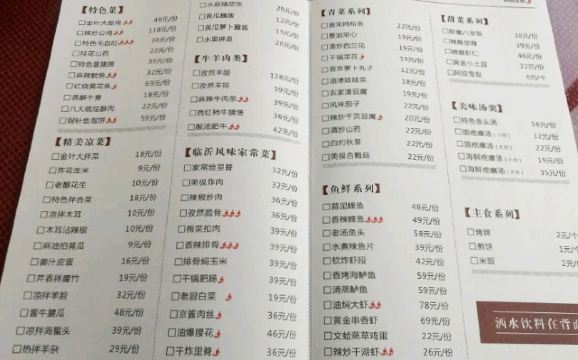 桂花山药,毛血旺,美极肉片,大盘鸡,麻辣牛肉条,家常烩里脊,金叶大拌菜,孜然羊排,风味茄子,炸牛蒡,蒜蓉西兰花,香烤海鲈鱼,农家渣豆腐,烤羊腿,香辣排骨,炸藕,蒜泥鲤鱼,大拌菜,辣子鸡,羊排