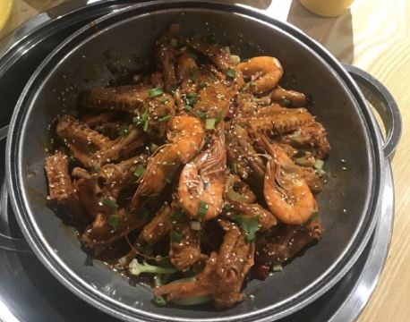 虽然说鸭掌火锅是这家的招牌特色,但是这里的其他锅底也是很好吃的,个人最为推崇的还是大虾锅,有种甜辣酱的感觉,小凉菜还是免费的