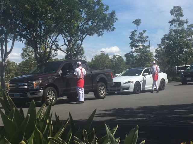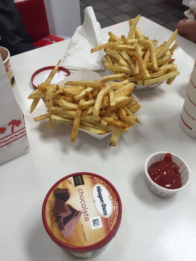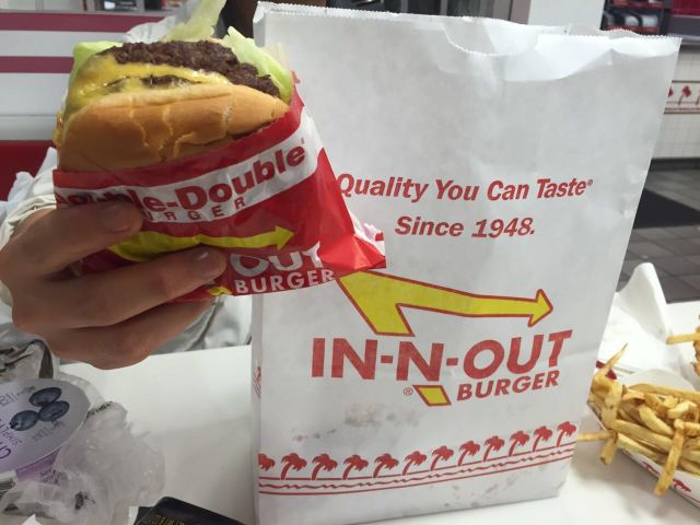 因为顺路,忍受了极长的队伍,买到了加州最有名的一家汉堡, in-n-out burger. 这家店菜单上只有三种汉堡。牛肉现烤,配以新鲜的生菜番茄。薯条是用土豆直接切开炸。店内没有冷冻柜,一切追求新鲜。据说1948年是三个兄弟合开的。后来三人先后去世,剩了三个寡妇继续经营。只在除加州外的很有限外州有分店。拒绝上市,不缺钱。一种秘制调味酱,风格独特。 曾经有一个有名的广告。一个加州的孩子考取了哈佛大学。却因为想念这家汉堡非要退学。可见其魅力。