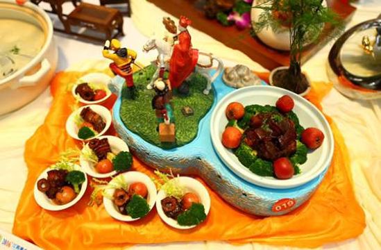 葱香粒粒掌中宝,红烧黄河大鲤鱼,金牌红子鸡,全聚德精品烤鸭,连汤肉片,鸿运当头,高炉烧饼,精品牡丹燕菜,红子鸡,手撕牛肉,糊涂面
