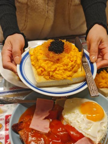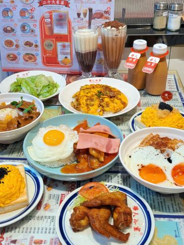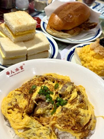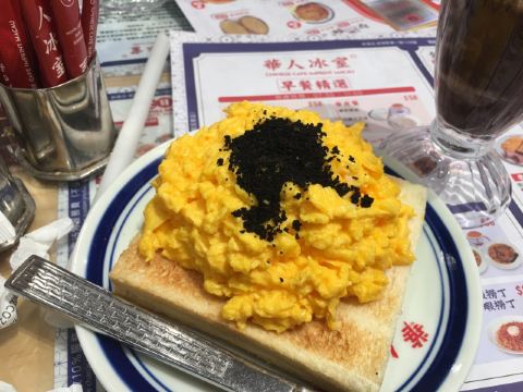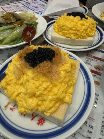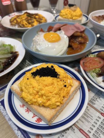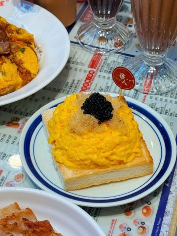 华人樽仔奶茶,黑松露炒蛋多士,滑牛饭,微辣沙一丁,鱼子酱马介休炒蛋多士 ,澳门猪扒包,鱼翅花胶汤面