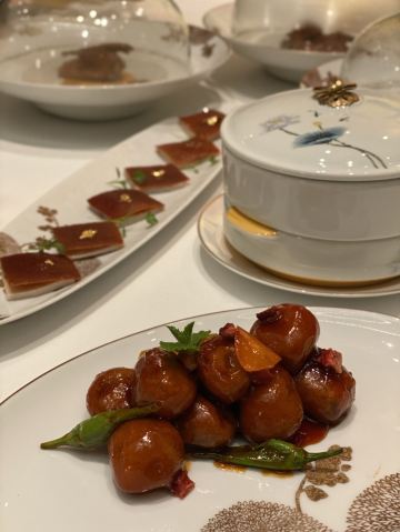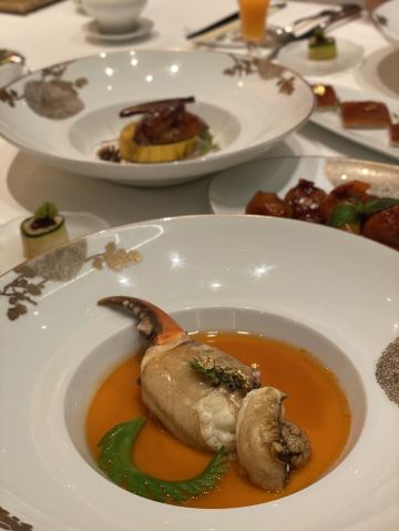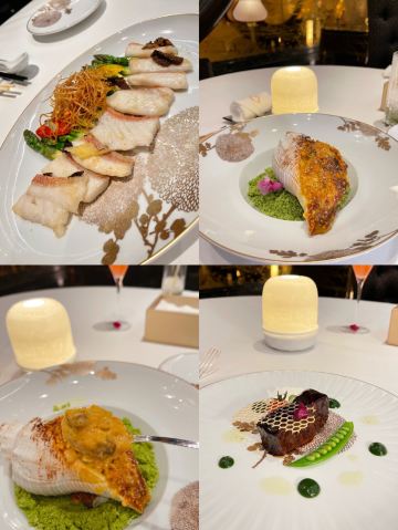 芙蓉珍珠烩法国蓝龙虾,香酥荔蓉带子,牡丹虎虾球,原只鲜蟹钳,茅台菊花杏仁冻,太史凤凰羹,贵妃葵花鸡,鱼子海胆焗酿蟹盖 ,太史鹧鸪官燕羹,乳猪焗饭,黄金雪花肥牛,一品红烧肉,帝王蟹花胶灌汤饺,原只 28 头日本吉品鲍,蜂蜜牛小排